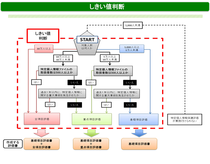 評価には3種類あり、「基礎項目評価書」、「重点項目評価書」、「全項目評価書」があり、下図の通りのしきい値によって切り分けられます。